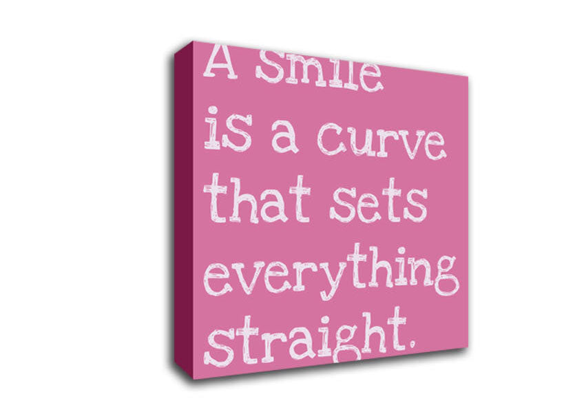 Motivational Quote Smile Is A Curve Pink Square Canvas Print handmade in the UK. Stretched over a 2 inch thick wooden box frame, ready to hang on your wall.