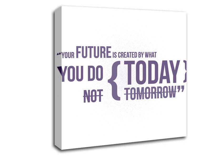 Motivational Quote Your Future Is Created By What You Do Lilac Square Canvas Print handmade in the UK. Stretched over a 2 inch thick wooden box frame, ready to hang on your wall.