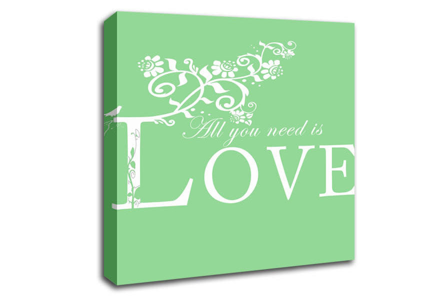 Music Quote All You Need Is Love Green Square Canvas Print handmade in the UK. Stretched over a 2 inch thick wooden box frame, ready to hang on your wall.