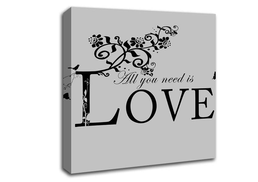 Music Quote All You Need Is Love Grey Square Canvas Print handmade in the UK. Stretched over a 2 inch thick wooden box frame, ready to hang on your wall.