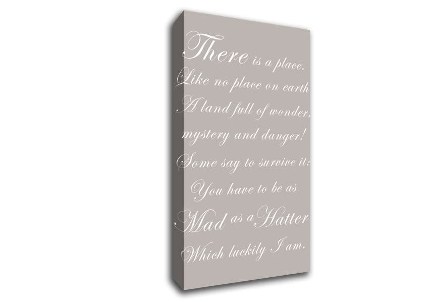 Alice In Wonderland As Mad As A Hatter Beige Wide Canvas Print handmade in the UK. Stretched over a 2 inch thick wooden box frame, ready to hang on your wall.