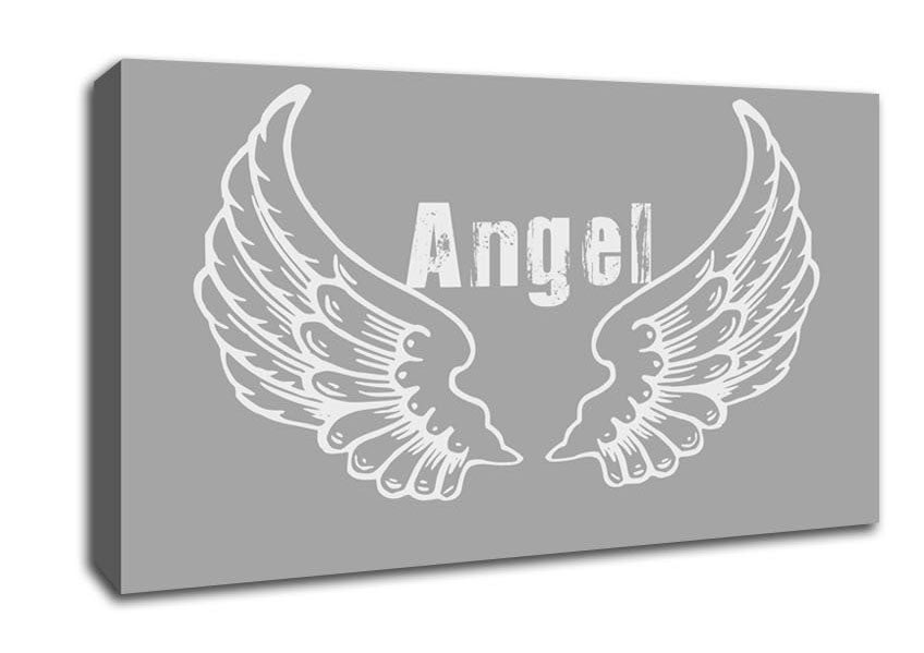 Angel Wings 2 Grey White Wide Canvas Print handmade in the UK. Stretched over a 2 inch thick wooden box frame, ready to hang on your wall.