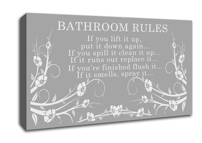 Bathroom Quote Bathroom Rules 2 Grey White Wide Canvas Print handmade in the UK. Stretched over a 2 inch thick wooden box frame, ready to hang on your wall.