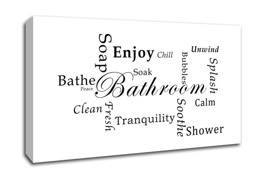 Bathroom Quote Bathroom Tranquility White Wide Canvas Print handmade in the UK. Stretched over a 2 inch thick wooden box frame, ready to hang on your wall.