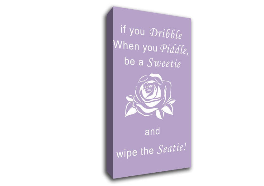 Bathroom Quote If You Dribble Lilac Wide Canvas Print handmade in the UK. Stretched over a 2 inch thick wooden box frame, ready to hang on your wall.