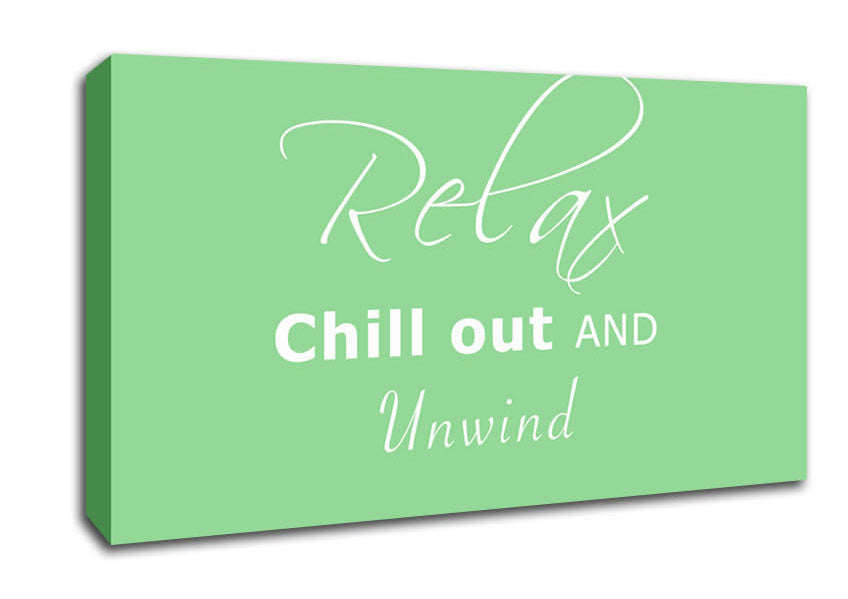Bathroom Quote Relax Chill Out Green Wide Canvas Print handmade in the UK. Stretched over a 2 inch thick wooden box frame, ready to hang on your wall.