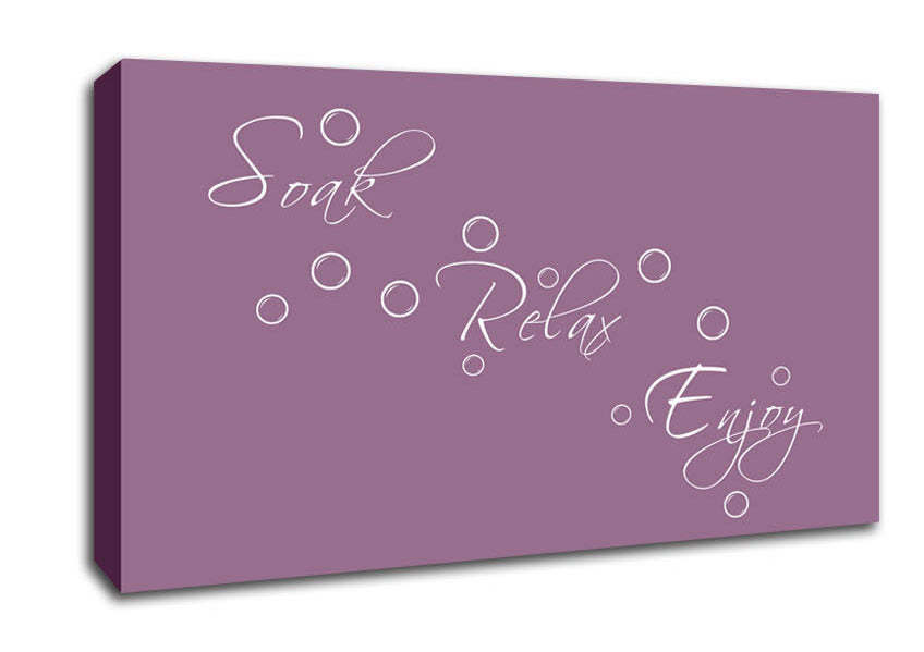 Bathroom Quote Soak Relax Enjoy Dusty Pink Wide Canvas Print handmade in the UK. Stretched over a 2 inch thick wooden box frame, ready to hang on your wall.