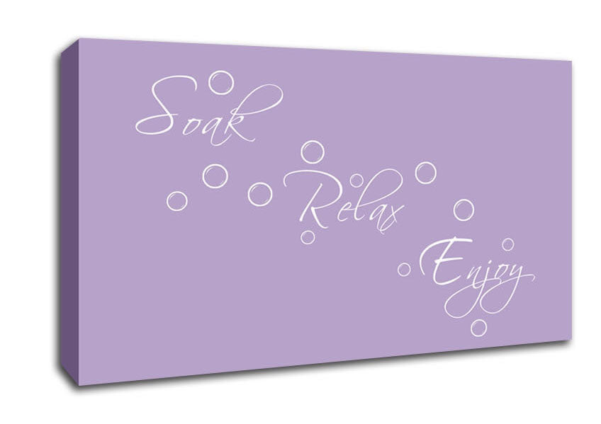 Bathroom Quote Soak Relax Enjoy Lilac Wide Canvas Print handmade in the UK. Stretched over a 2 inch thick wooden box frame, ready to hang on your wall.