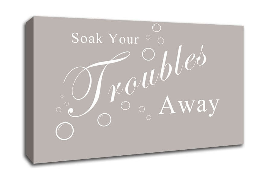 Bathroom Quote Soak Your Troubles Away Beige Wide Canvas Print handmade in the UK. Stretched over a 2 inch thick wooden box frame, ready to hang on your wall.