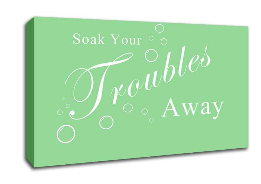 Bathroom Quote Soak Your Troubles Away Green Wide Canvas Print handmade in the UK. Stretched over a 2 inch thick wooden box frame, ready to hang on your wall.