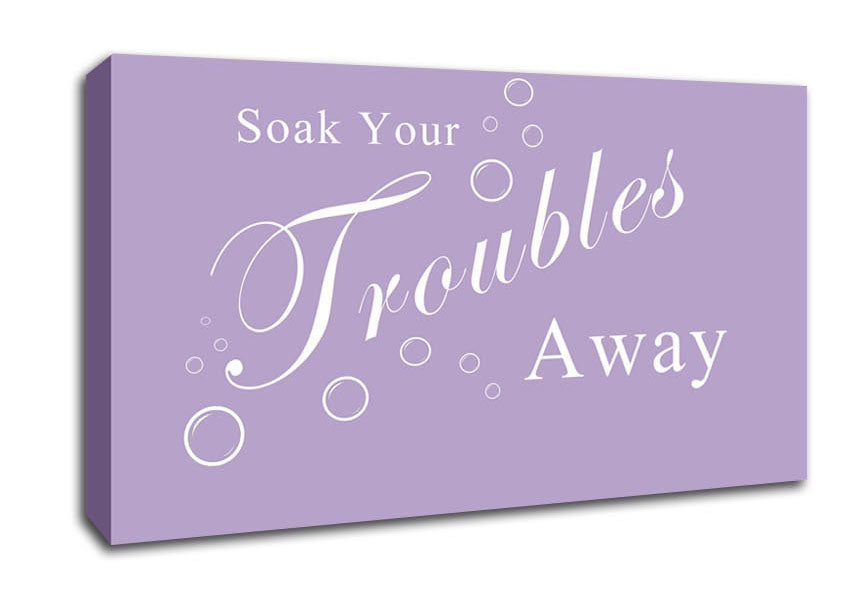 Bathroom Quote Soak Your Troubles Away Lilac Wide Canvas Print handmade in the UK. Stretched over a 2 inch thick wooden box frame, ready to hang on your wall.