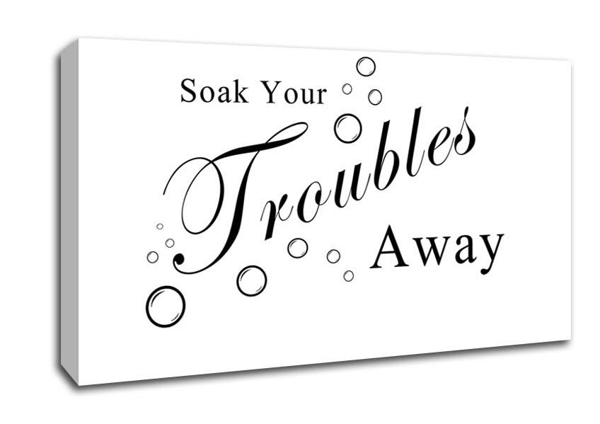 Bathroom Quote Soak Your Troubles Away White Wide Canvas Print handmade in the UK. Stretched over a 2 inch thick wooden box frame, ready to hang on your wall.