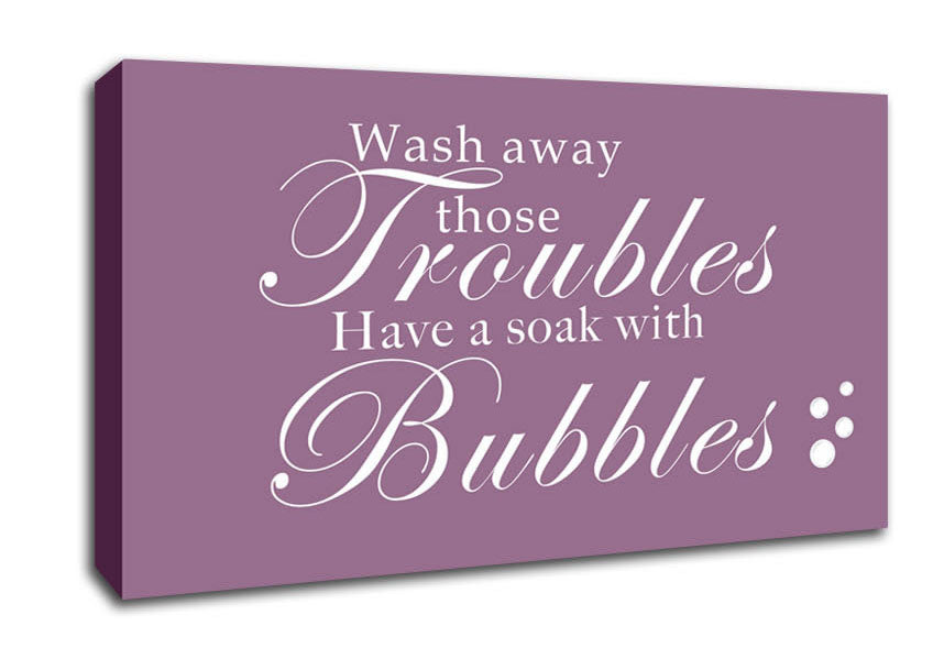 Bathroom Quote Wash Away Those Troubles Bubbles Dusty Pink Wide Canvas Print handmade in the UK. Stretched over a 2 inch thick wooden box frame, ready to hang on your wall.