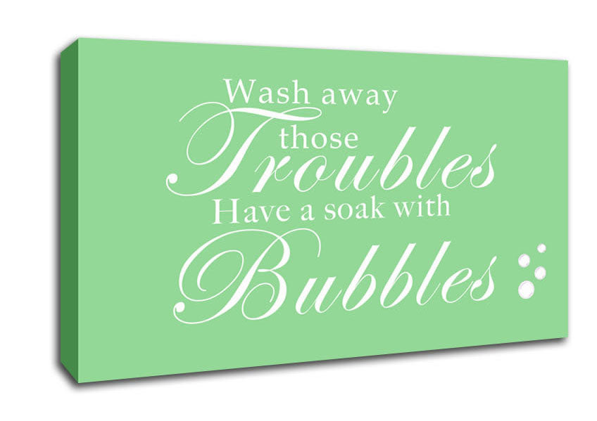 Bathroom Quote Wash Away Those Troubles Bubbles Green Wide Canvas Print handmade in the UK. Stretched over a 2 inch thick wooden box frame, ready to hang on your wall.