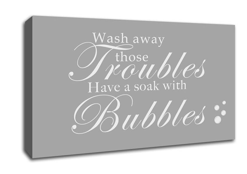 Bathroom Quote Wash Away Those Troubles Bubbles Grey White Wide Canvas Print handmade in the UK. Stretched over a 2 inch thick wooden box frame, ready to hang on your wall.