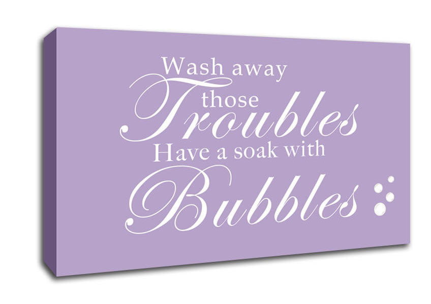 Bathroom Quote Wash Away Those Troubles Bubbles Lilac Wide Canvas Print handmade in the UK. Stretched over a 2 inch thick wooden box frame, ready to hang on your wall.
