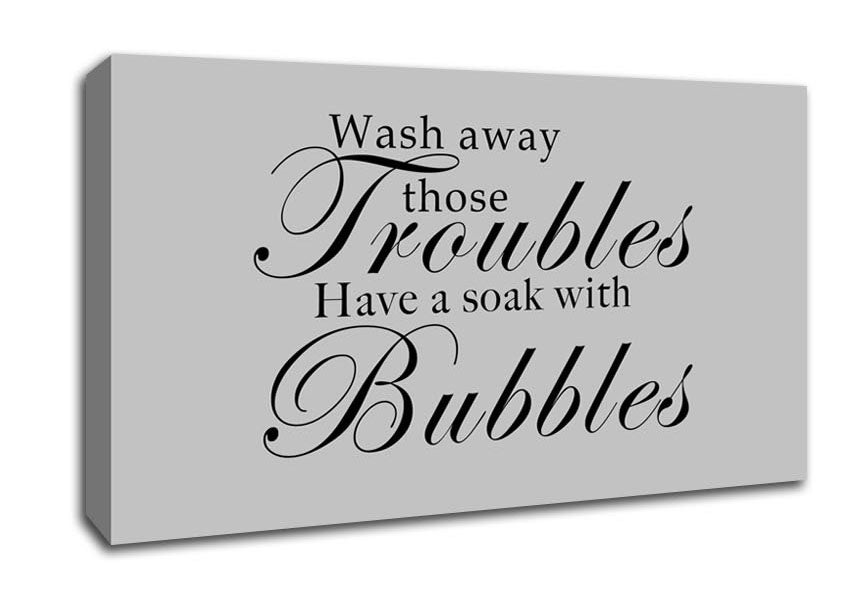 Bathroom Quote Wash Away Those Troubles Grey Wide Canvas Print handmade in the UK. Stretched over a 2 inch thick wooden box frame, ready to hang on your wall.