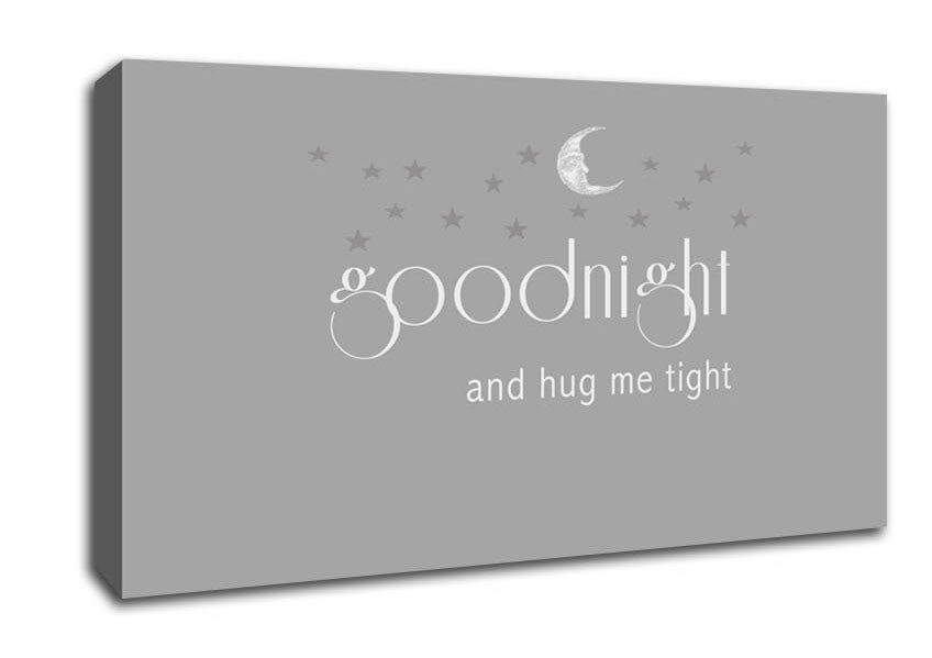 Boys room Quote Good Night And Hug Me Tight Grey White Wide Canvas Print handmade in the UK. Stretched over a 2 inch thick wooden box frame, ready to hang on your wall.