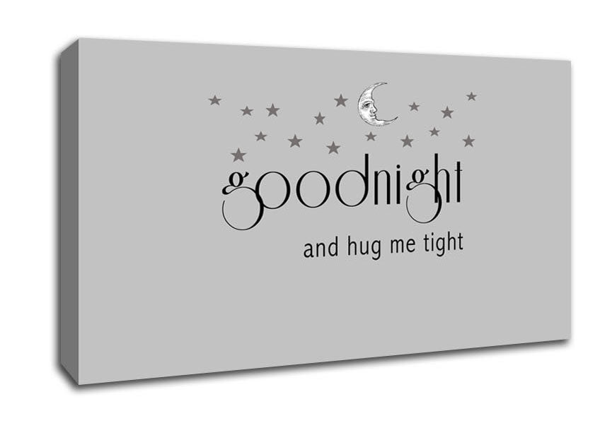 Boys room Quote Good Night And Hug Me Tight Grey Wide Canvas Print handmade in the UK. Stretched over a 2 inch thick wooden box frame, ready to hang on your wall.