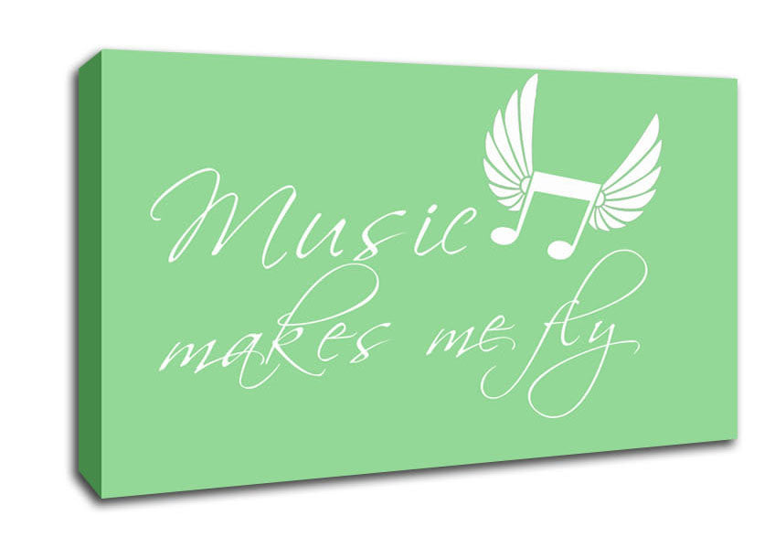 Boys room Quote Music Makes Me Fly Green Wide Canvas Print handmade in the UK. Stretched over a 2 inch thick wooden box frame, ready to hang on your wall.