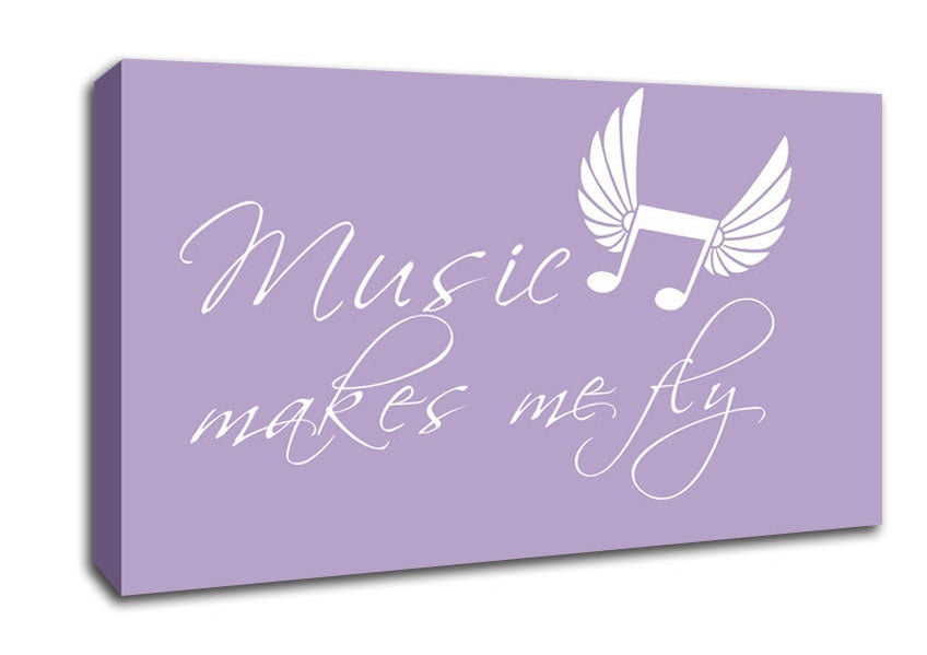 Boys room Quote Music Makes Me Fly Lilac Wide Canvas Print handmade in the UK. Stretched over a 2 inch thick wooden box frame, ready to hang on your wall.