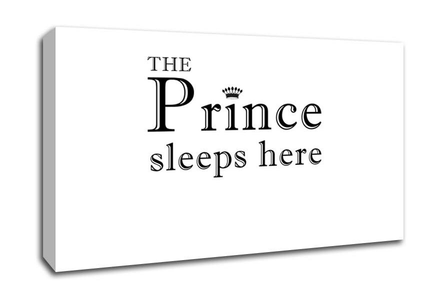 Boys room Quote The Prince Sleeps Here White Wide Canvas Print handmade in the UK. Stretched over a 2 inch thick wooden box frame, ready to hang on your wall.