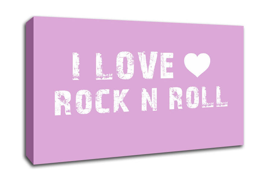 Music Quote I Love Rock N Roll Pink Wide Canvas Print handmade in the UK. Stretched over a 2 inch thick wooden box frame, ready to hang on your wall.