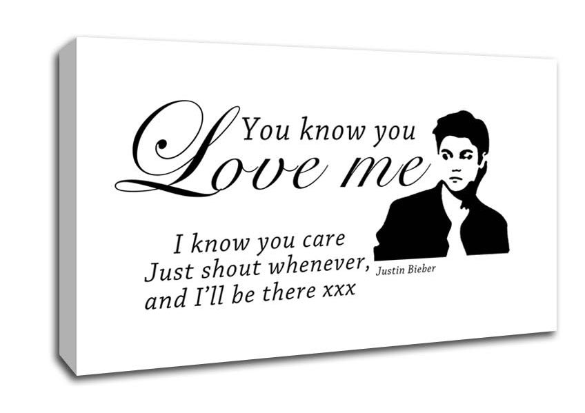 Music Quote You Know You Love Me Justin Bieber White Wide Canvas Print handmade in the UK. Stretched over a 2 inch thick wooden box frame, ready to hang on your wall.