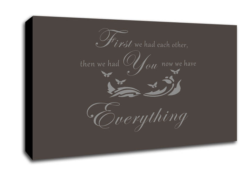 Nursery Quote First We Had Each Other Chocolate Wide Canvas Print handmade in the UK. Stretched over a 2 inch thick wooden box frame, ready to hang on your wall.