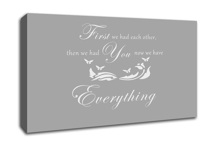 Nursery Quote First We Had Each Other Grey White Wide Canvas Print handmade in the UK. Stretched over a 2 inch thick wooden box frame, ready to hang on your wall.
