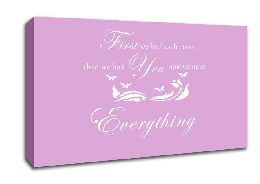 Nursery Quote First We Had Each Other Pink Wide Canvas Print handmade in the UK. Stretched over a 2 inch thick wooden box frame, ready to hang on your wall.