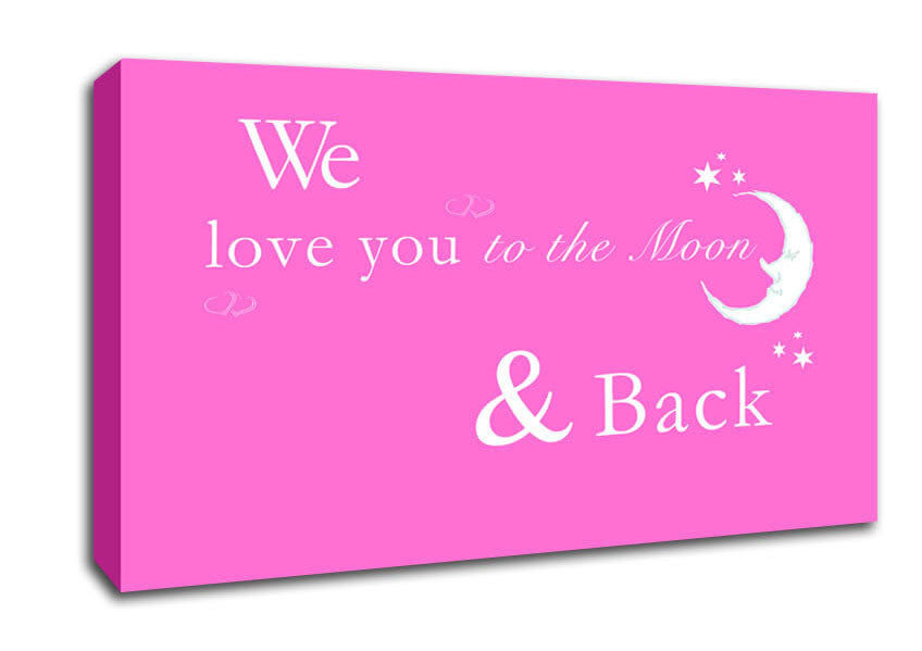 Nursery Quote We Love You To The Moon And Back 2 Vivid Pink Wide Canvas Print handmade in the UK. Stretched over a 2 inch thick wooden box frame, ready to hang on your wall.