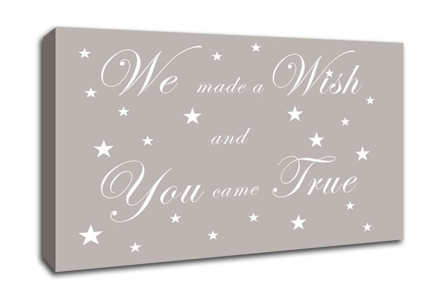 Nursery Quote We Made A Wish And You Came True Beige Wide Canvas Print handmade in the UK. Stretched over a 2 inch thick wooden box frame, ready to hang on your wall.