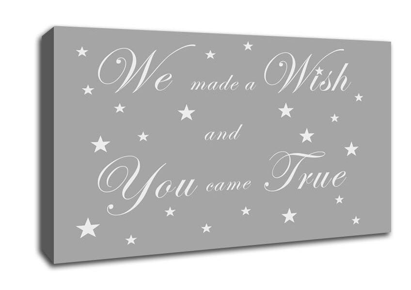 Nursery Quote We Made A Wish And You Came True Grey White Wide Canvas Print handmade in the UK. Stretched over a 2 inch thick wooden box frame, ready to hang on your wall.