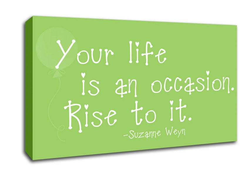 Suzanne Weyn Your Life Is An Occasion Lime Green Wide Canvas Print handmade in the UK. Stretched over a 2 inch thick wooden box frame, ready to hang on your wall.