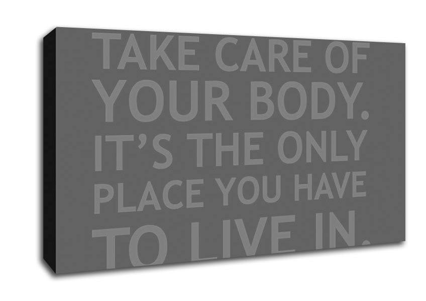 Take Care Of Your Body Grey Wide Canvas Print handmade in the UK. Stretched over a 2 inch thick wooden box frame, ready to hang on your wall.