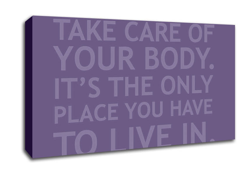 Take Care Of Your Body Lilac Wide Canvas Print handmade in the UK. Stretched over a 2 inch thick wooden box frame, ready to hang on your wall.