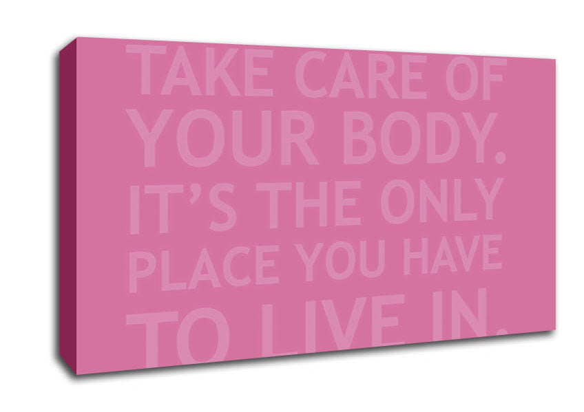 Take Care Of Your Body Pink Wide Canvas Print handmade in the UK. Stretched over a 2 inch thick wooden box frame, ready to hang on your wall.