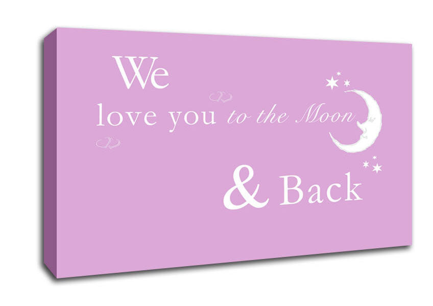 We Love You To The Moon And Back 2 Pink Wide Canvas Print handmade in the UK. Stretched over a 2 inch thick wooden box frame, ready to hang on your wall.