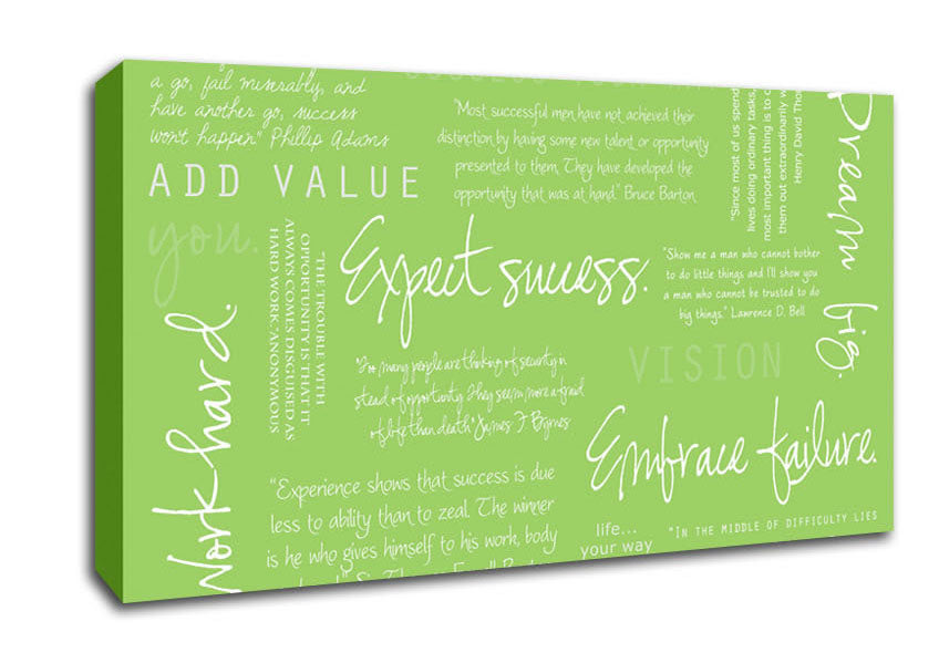 Work Hard Dream Big Expect Success Lime Green Wide Canvas Print handmade in the UK. Stretched over a 2 inch thick wooden box frame, ready to hang on your wall.