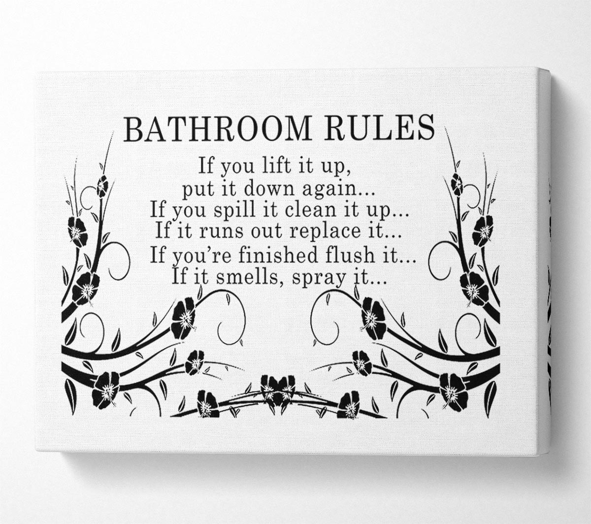 Bathroom Quote Bathroom Rules 2 White Canvas Print handmade in the UK. Stretched over a 2 inch thick wooden box frame, ready to hang on your wall.