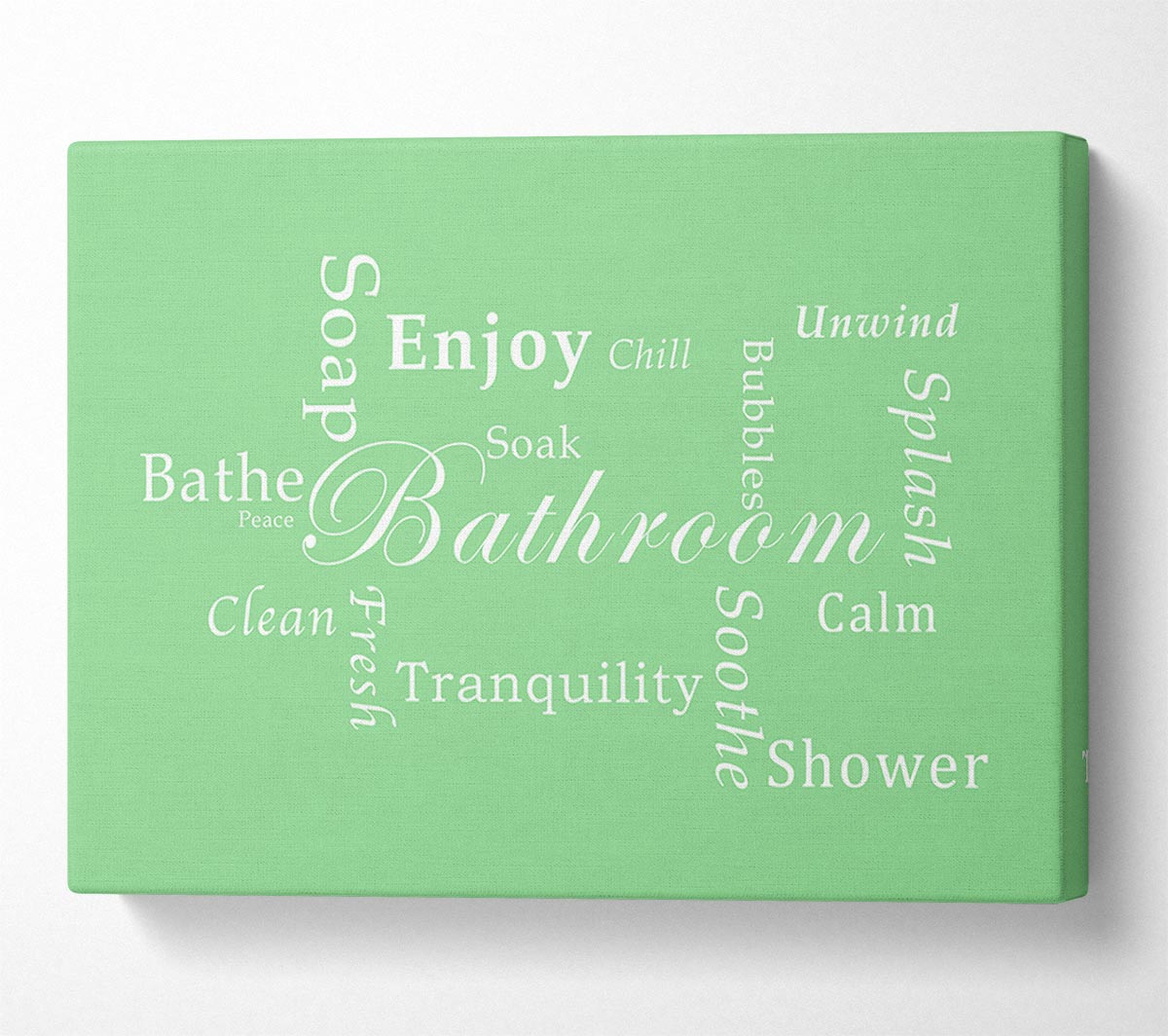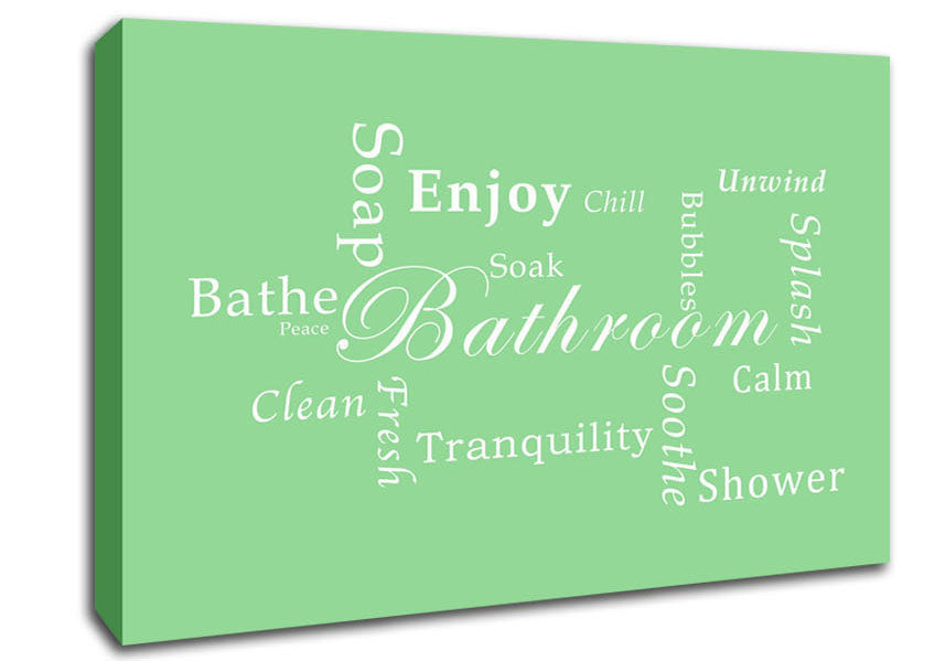 Bathroom Quote Bathroom Tranquility Green Canvas Print handmade in the UK. Stretched over a 2 inch thick wooden box frame, ready to hang on your wall.