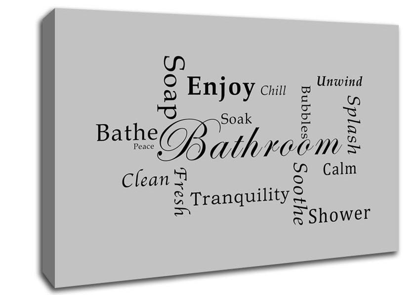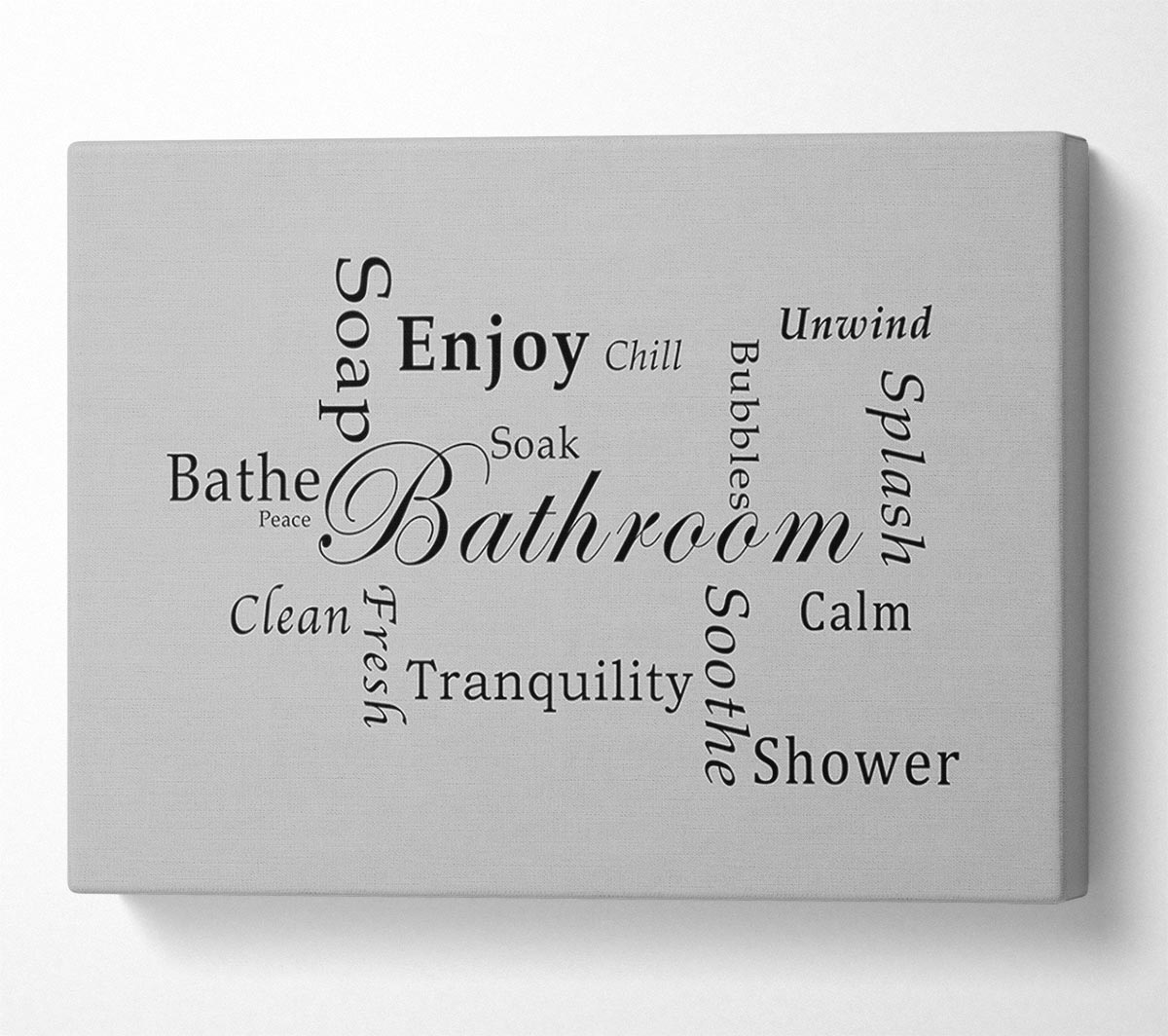 Bathroom Quote Bathroom Tranquility Grey Canvas Print handmade in the UK. Stretched over a 2 inch thick wooden box frame, ready to hang on your wall.