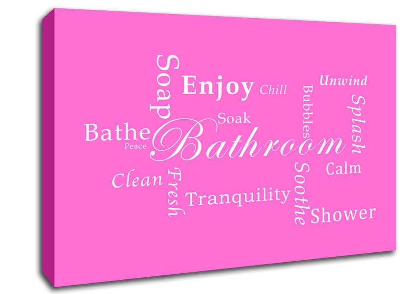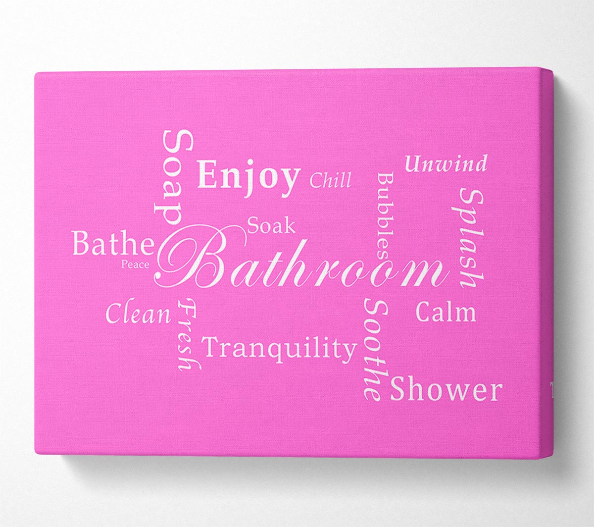 Bathroom Quote Bathroom Tranquility Vivid Pink Canvas Print handmade in the UK. Stretched over a 2 inch thick wooden box frame, ready to hang on your wall.