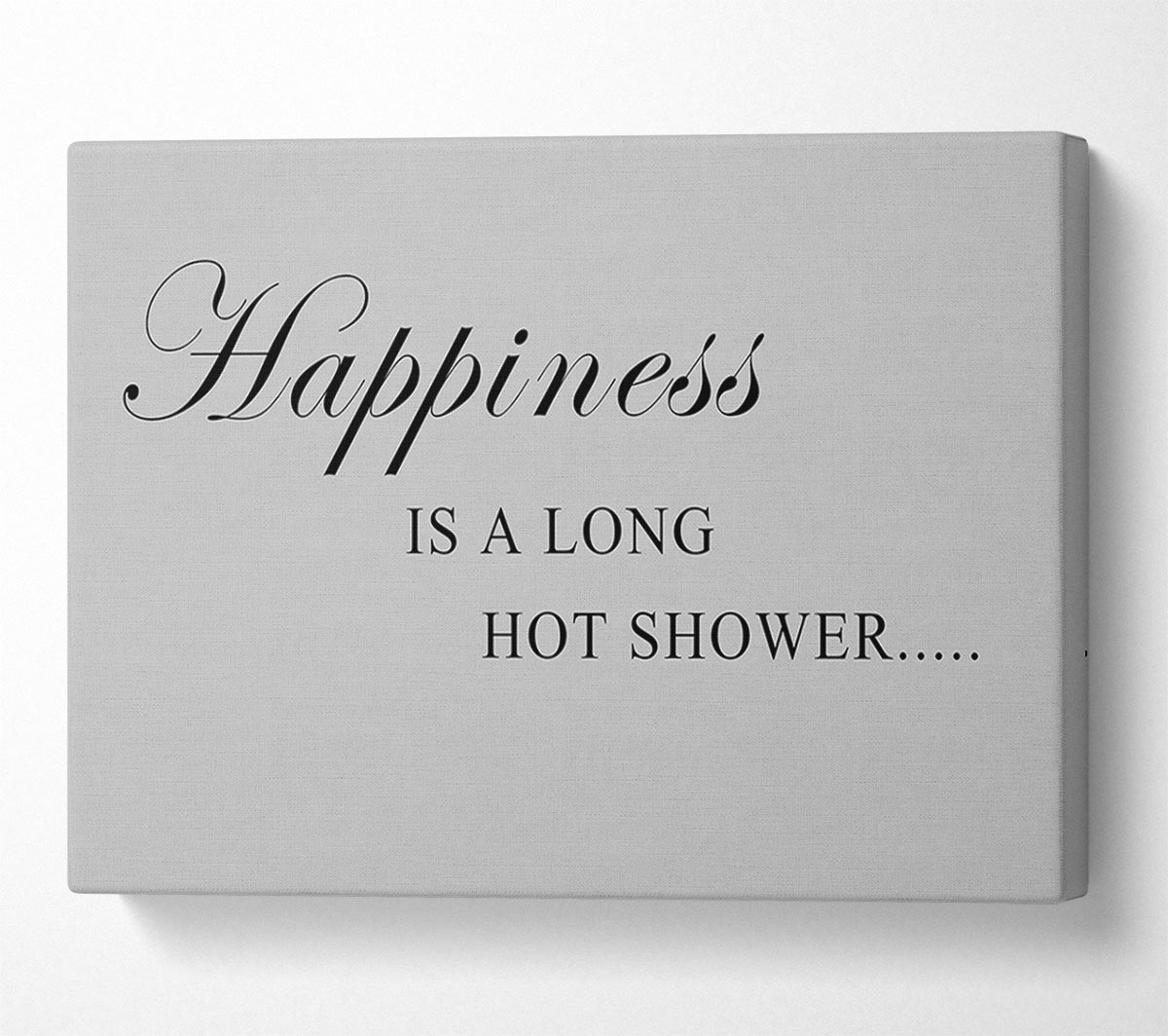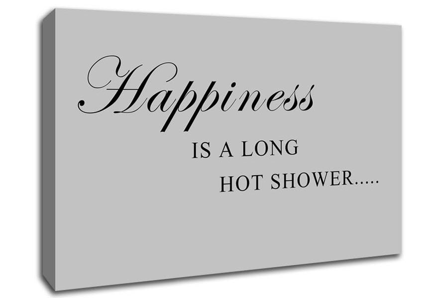 Bathroom Quote Happiness Is A Long Hot Shower Grey Canvas Print handmade in the UK. Stretched over a 2 inch thick wooden box frame, ready to hang on your wall.