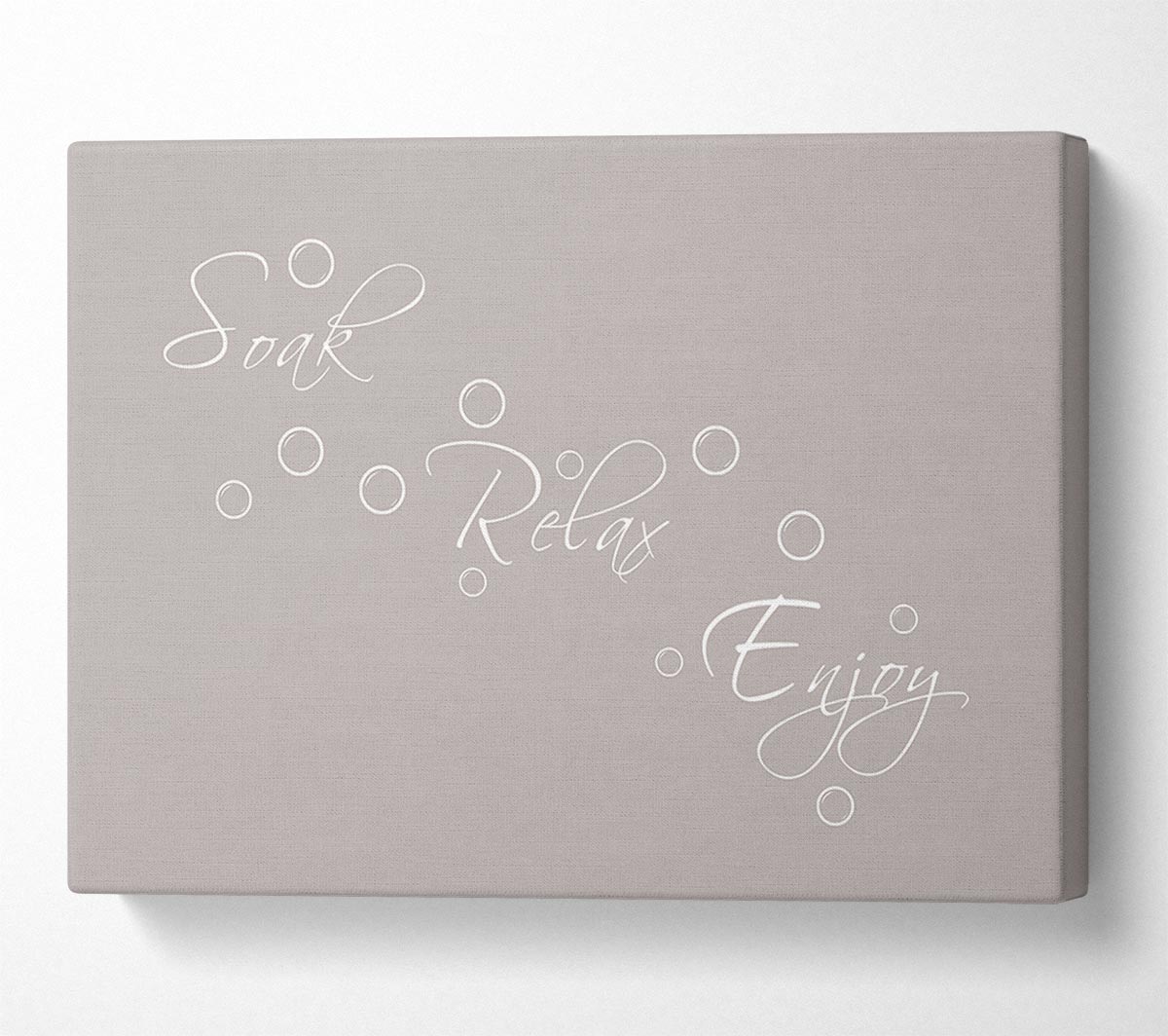 Bathroom Quote Soak Relax Enjoy Beige Canvas Print handmade in the UK. Stretched over a 2 inch thick wooden box frame, ready to hang on your wall.