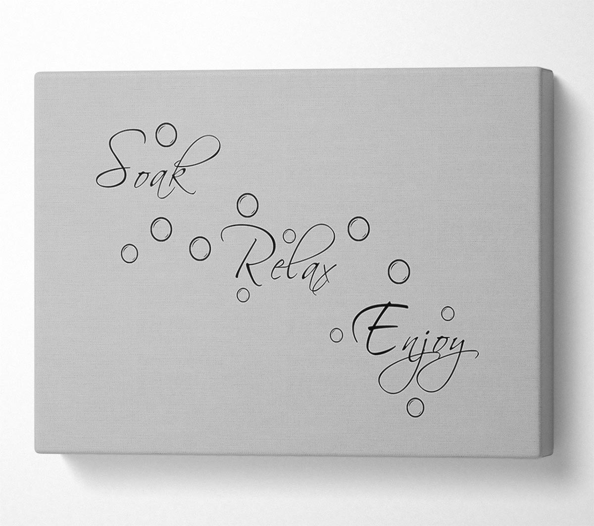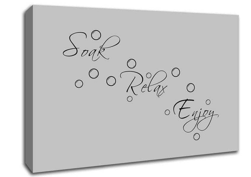 Bathroom Quote Soak Relax Enjoy Grey Canvas Print handmade in the UK. Stretched over a 2 inch thick wooden box frame, ready to hang on your wall.
