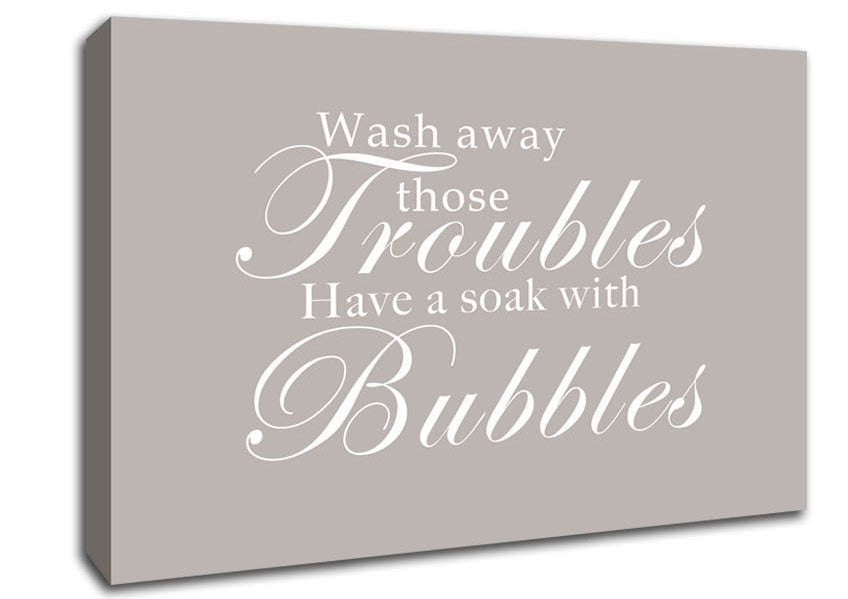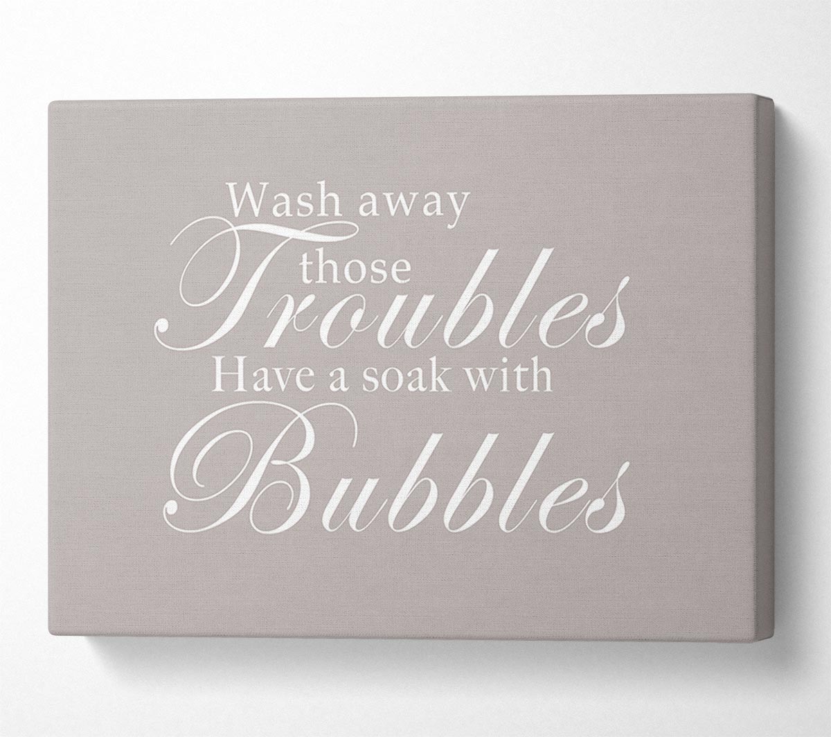 Bathroom Quote Wash Away Those Troubles Beige Canvas Print handmade in the UK. Stretched over a 2 inch thick wooden box frame, ready to hang on your wall.