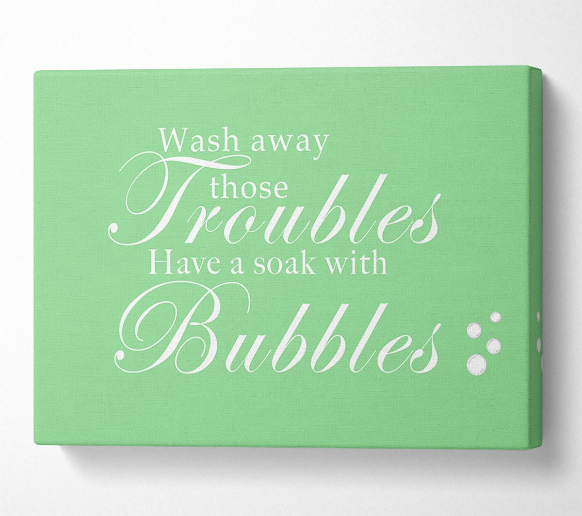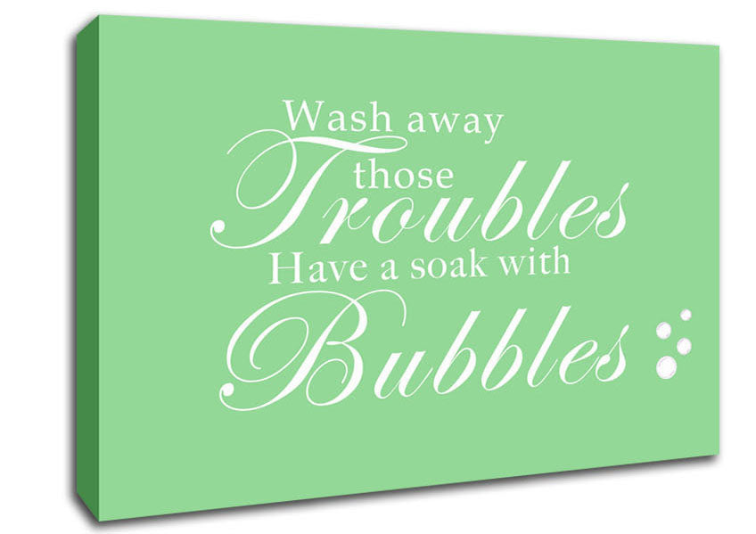 Bathroom Quote Wash Away Those Troubles Bubbles Green Canvas Print handmade in the UK. Stretched over a 2 inch thick wooden box frame, ready to hang on your wall.
