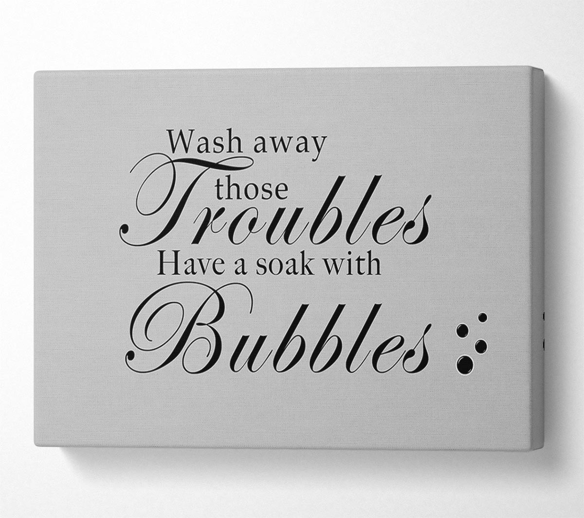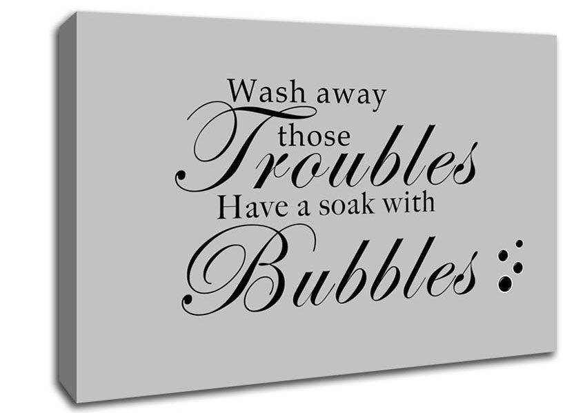 Bathroom Quote Wash Away Those Troubles Bubbles Grey Canvas Print handmade in the UK. Stretched over a 2 inch thick wooden box frame, ready to hang on your wall.
